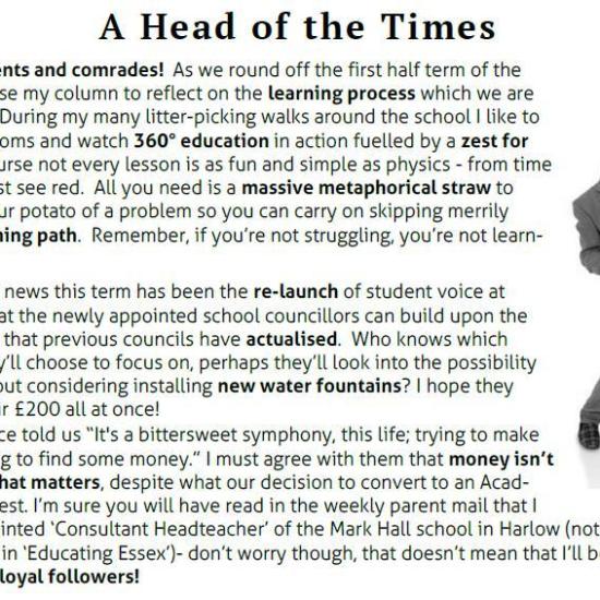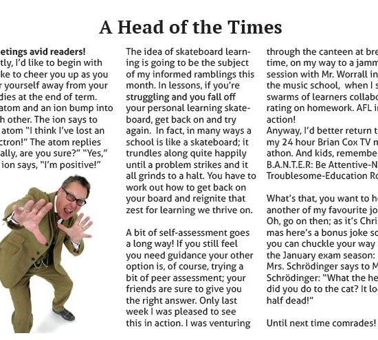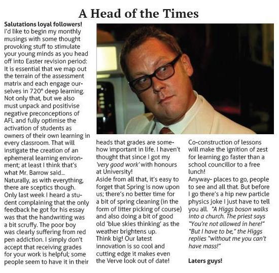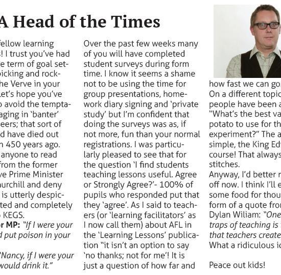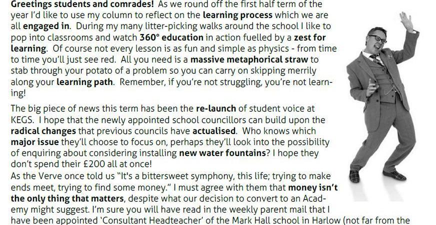 My students run their own newspaper The KEGS Ambassador.  A regular feature parodies my various prononouncements, words of wisdom and a foolish reference, long ago, to having taught members of the Verve. For some reason,  I am represented by Vic Reeves…….. which is fine by me!