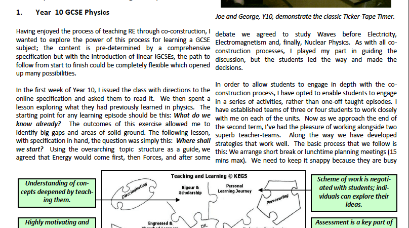 This issue of the KEGS Learning Lessons series describes how students have been involved in planning and delivering the IGCSE Physics course  and the Year 7 RE course.