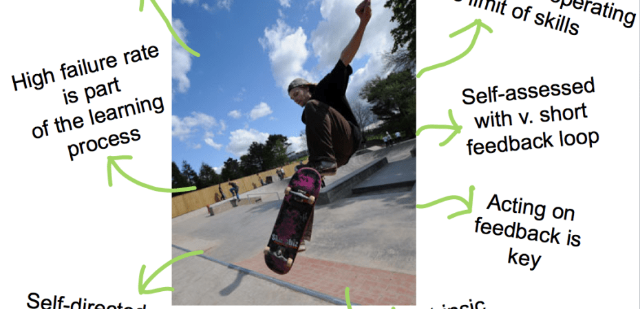 The ‘skate-boarding lessons’ idea is a regular feature in my CPD sessions. The ‘really rubbish skateboarding lesson’ always gets a laugh. But it is challenging…. how much of the stuff we teach could be delivered so that students could have the freedom and autonomy of the skatepark and all the richness of peer support that comes with it? Perhaps not much – but the general principle is still valid: are we simply too controlling and might it not be possible, given the right philosophy and environment, to give students more opportunities for self-discovery, learning from mistakes and taking risks?