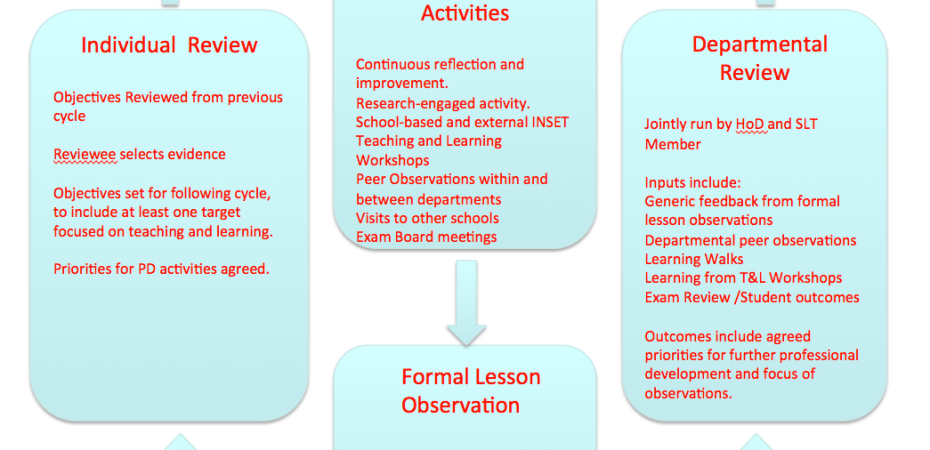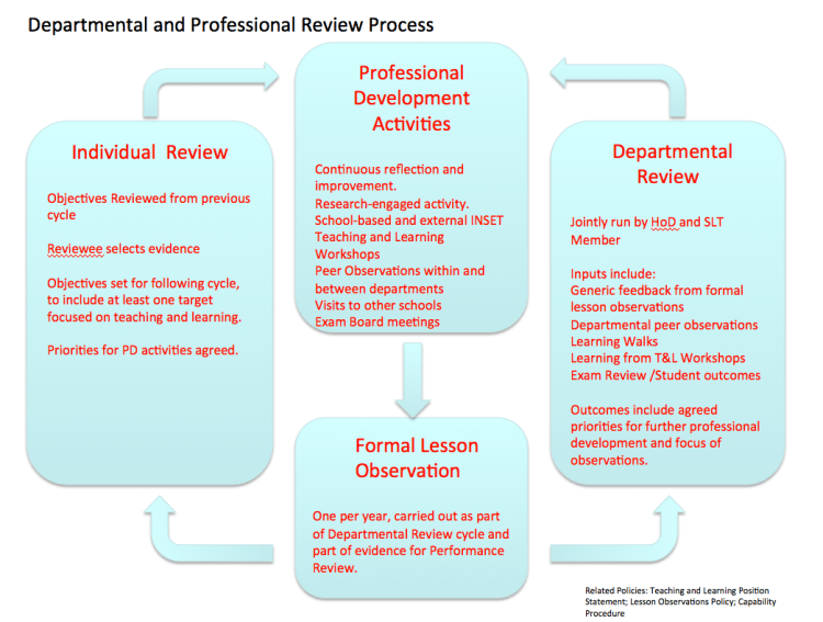 - After everyone has been seen individually and received detailed individual feedback, the Departmental Review meeting is important in bringing everyone in the team together with the SLT observer to discuss common areas of strength and common areas for development. This can be linked to other inputs such as issues stemming from exam results and student feedback. In stressing the commonality of these issues, the collaborative, peer support element has a powerful effect both in terms of modelling excellent practice (it is powerful to stress that, within a team, excellent practice of a particular kind is possible and is happening) and sharing the need to work on specific areas of improvement together. (rather than each teacher feeling their development issues are theirs alone.)