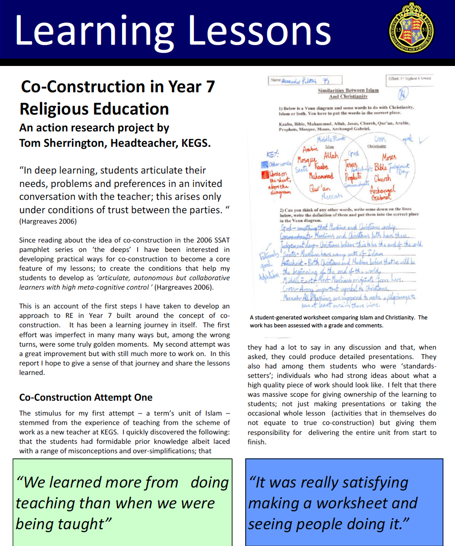 Having written about co-construction in our Learning Lessons publication (Vol 2/ Issue 8 and Vol 3/ Issue 3), also profiled in this post I was invited to run some CPD sessions in two schools and then to write a summary of the process. It is a fabulously enriching way to approach teaching and learning; here is my quick guide.