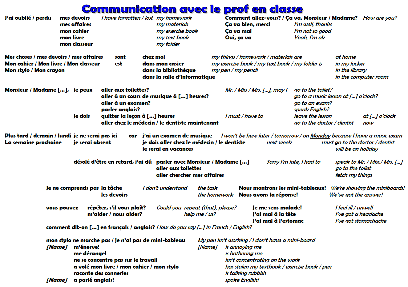This simple idea is borrowed from King John’s in Essex. Key vocabulary for student-teacher exchanges is written on laminated A3 sheets so that all the micro interactions (asking for a pen, to go to the toilet, complaining about a neighbour!) can be done in the target language. These are yellow in the photographs: