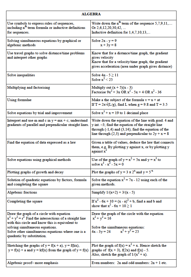 • Some students (like me) will value a helicopter overview of the entire course in order to see where they are going . Below, for example, is a summary of GCSE Algebra: Providing these resources and making them available at any time is very powerful for certain students. It shows them the Big Picture so that they can take greater ownership of their own journey.  This has been a strength of my co-construction explorations. The students know exactly where we are at any time.
