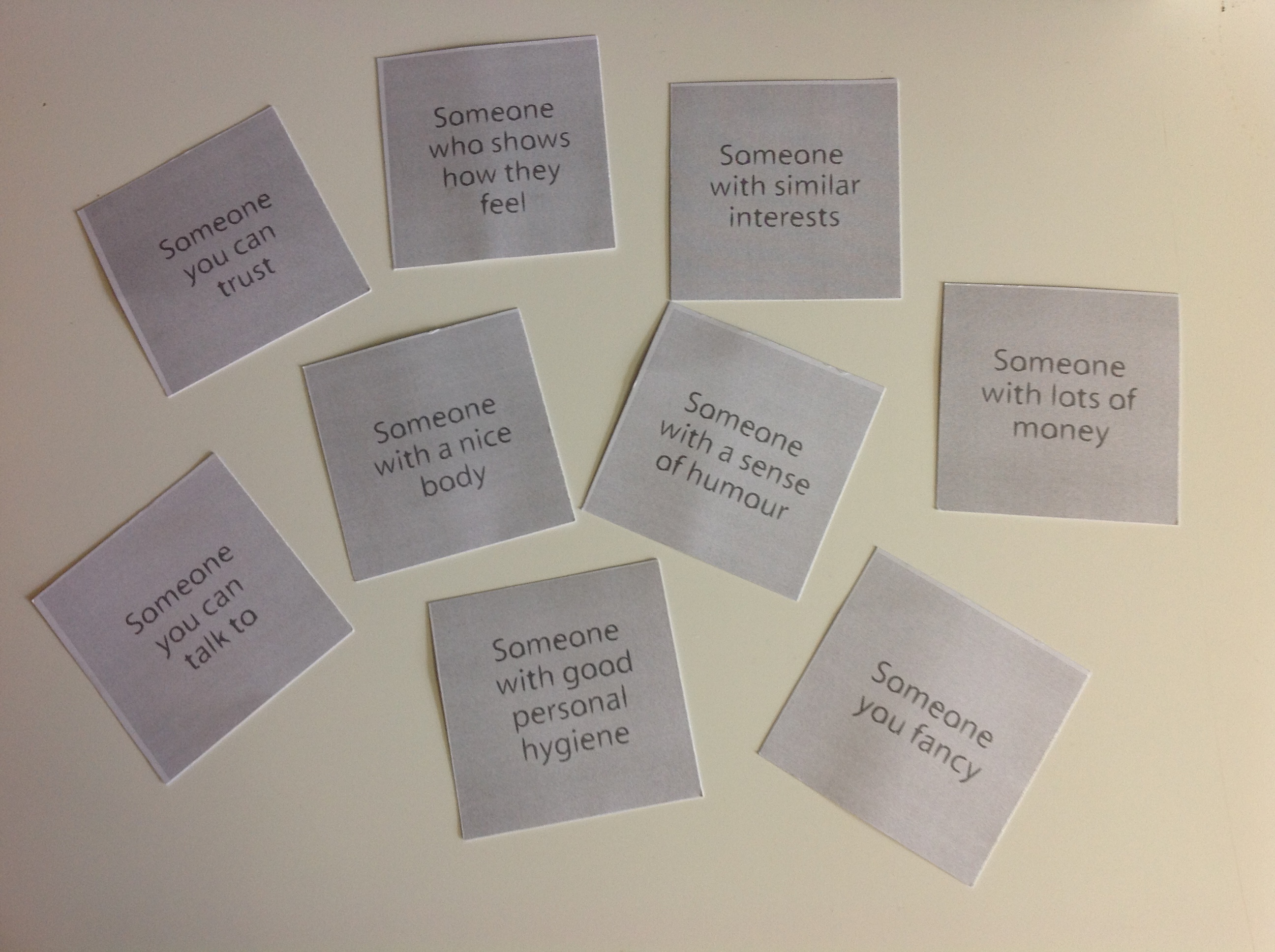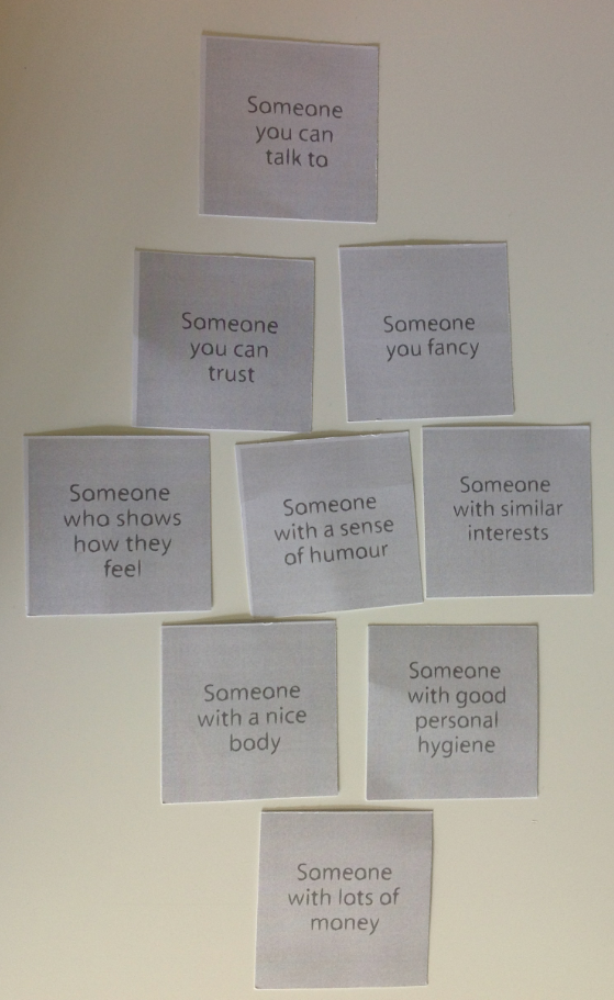 In theory there are no right answers but actually there are some definite wrong ones. I challenge groups that go for ‘nice body’ near the top.. usually this is laced with some bravado and it brings the issue of peer pressure to the fore. Trust is another great topic. We talk about scenarios where intimate moments in relationships are shared with friends and how people feel about this. Interestingly, boys will admit that they might tease and talk about their friends as they enter into relationships even though they’d hate it to happen to them.. “I don’t know why; it’s just what we do” one boy said recently. This honesty and openness is very healthy and the discussions that surround it are powerful.
