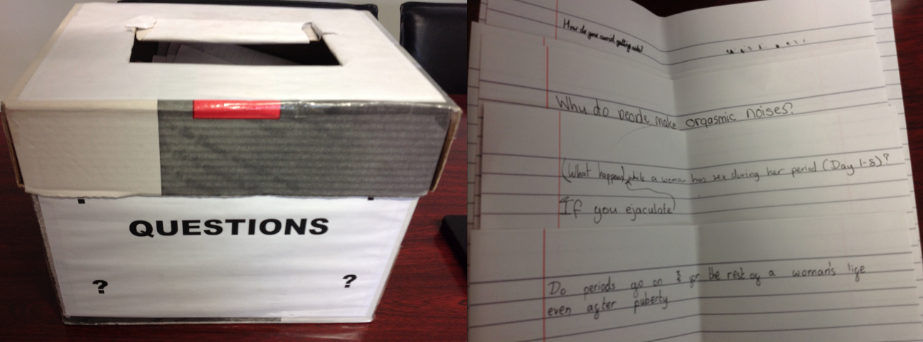 Sounds like a good idea.. thanks for the comment. In today’s lesson the range of questions was amazing – circumcision, masturbation, appropriate age for sex – is it ever ok to watch porn, and a question about how to handle it if you fancy boys.. (boys school). I was pleased that the anonymity and class atmosphere allowed a boy to ask a question about being gay.