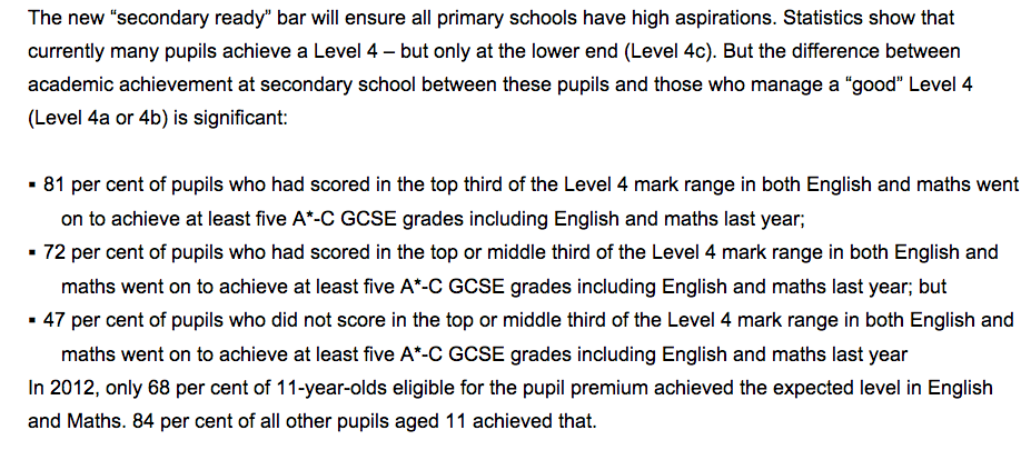 I’m not sure I entirely agree with your final point though – that it is no different telling a pupil that they are 6c or 3b than it is telling them in which decile they are ranked. *In theory* the levels should actually *mean something* in terms of a set of skills that have been acquired. And if the DfE’s goal is that every pupil should leave primary school with at least a level 4b, then that ought to be actually achievable, provided that the level retains its meaning in terms of the skills that must be acquired. (This might be more of an argument for teacher assessment in favour of tests, given some of the issues around test standardisation that you have illustrated.) The decile band is, in my view, not a helpful piece of information to give a child. “At this moment in time, based on your performance on this day, this is how you compare to everyone else.” By the time you receive the information, it’s probably already wrong (if indeed it was ever right).