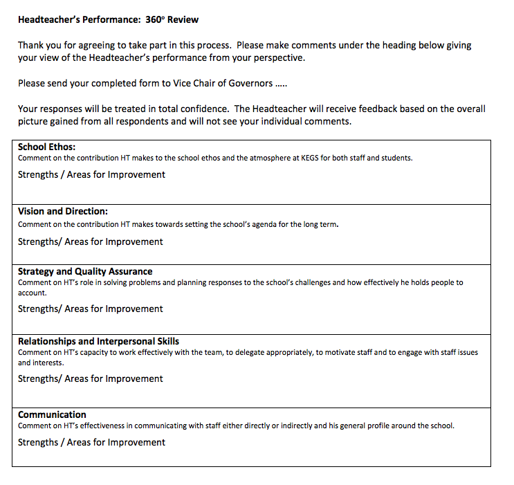 So, I’ve recently used these five categories as the basis of my review. It is the first 360 review I’ve ever done – a strange aspect of being a Head is that people rarely give you honest feedback unless they’re being positive. However, I’ve found the process incredibly useful. The template we used was very simple. Here it is: