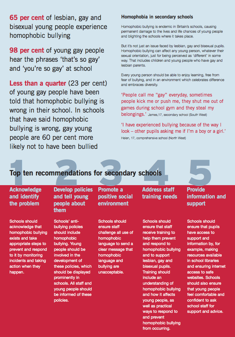 As these graphics from a Stonewall leaflet show, homophobia in schools is a very serious issue.  But there are some simple steps schools can take. (Download the pdf here: Secondary cornerstone )