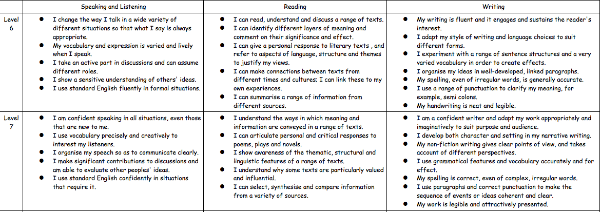 - ensure that the words used to describe the assessment are explained in the context of the content, not just the assessment. (eg knowing the meaning of ‘structure’ and ‘language’ as applied to a passage from a literary text; these should not be terms you only meet in relation to awarding NC levels. )