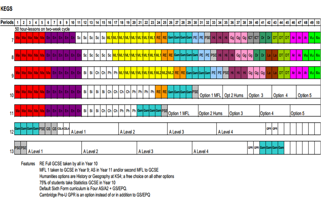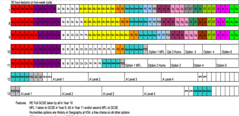 Interestingly, no two models from the original 70 I gathered are the same although there are lots of common features.  A two-week timetable of 50 hour-long lessons is the most common – like the KEGS model.  However, four KS4 options is the most common -whereas KEGS offers five.   There is then all manner of variation of time allocated to each subject at KS3 and KS4.  I find it fascinating.