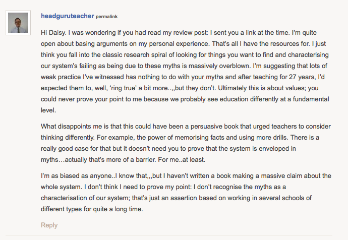 In her conclusion she says that she agrees with the aims of the people she disagrees with – but “the methods we are currently using to achieve these aims simply do not work”. That’s what doesn’t ring true. For Daisy, it’s not enough to suggest that the myths are out there and are potentially harmful – a position we could easily discuss one myth at a time; she is explicitly suggesting that the system in general is failing because of them; that ‘we’ are collectively using methods that don’t work. She goes too far; beyond her evidence base. She’s protested along the lines of ‘how much evidence do I need to show you to prove that I’m right?’ – citing more examples. In return, I’d say ‘how many teachers and school leaders working across the system need to say ‘the myths don’t ring true’ before you accept that maybe the myths don’t carry the weight you’re asserting?’