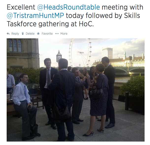 On July 15th, five members of the Headteachers’ Roundtable met Tristram Hunt at the House of Commons to discuss our Education Manifesto. Our original meeting had had to be re-scheduled when it clashed with maximum media fall-out from the Birmingham ‘Trojan Horse’ situation. Hearing the news that Michael Gove had been replaced at the DFE on the day of our meeting, we fully anticipated another push-back but we were in luck. In between division bells sounding for TH to rush out to vote and a Radio5 Live interview to comment on the end of the Gove era, we had a good hour of discussion.