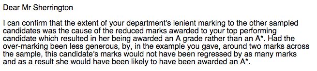 The situation was that one of our Year 9 students (let’s call her Jane) had a special interest and talent for Art and was entered alongside the Year 11 cohort.  All along her work stood out from the rest of the cohort; this made internal moderation quite complicated and, for numerous reasons, the marks submitted for the Y11s were on the generous side. As is right and proper, the moderator identified this over-marking and duly submitted a report that led to a regression of the marks. They were down-graded.  This would have been fair enough had it not been that the same process applied to Jane. The moderator noted that her work was marked within the normal tolerance; informally it was acknowledged that her work warranted an A*.  However, to our great disappointment, the final result was an A; a consequence of the global regression.   The idea that her work might be judged against some absolute standard for an A* was blown out of the water; the grade was just the outcome of a statistical manipulation; them’s the rules!