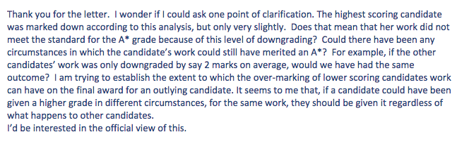 1. Well done: it isn’t, alas, an uncommon case, even if it is an uncommon outcome. Many students every year are affected by these unkind processes. It seems as though the boards lose all sense that they’re marking students’ work, and not constructing a neat mathematical solution. Data has taken over from reality in determining our students’ futures. When we ask for a re-mark, why can’t they – doh! – re-mark the script, rather than balance the statistics, shape the curve, smooth the line?!