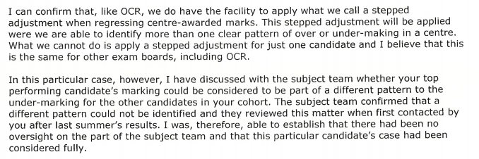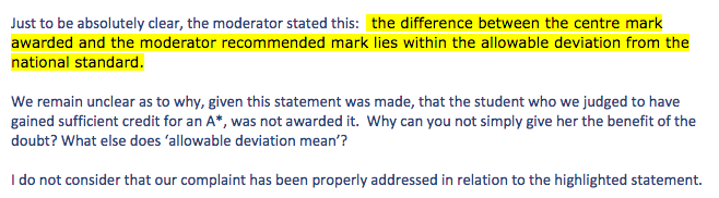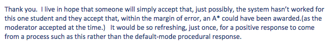 It’s a small victory in the grand scheme of things and we had to work far, far too hard for it – but it was worth it in the end. It highlights just how precarious some of these processes can be and how easy it is for one student’s grade to be swallowed by the machinery of a national exam board trying to maintain standards across the system.  The idea that  exam boards ‘cannot apply a stepped adjustment for just one candidate’ is totally unreasonable.  As it turns, out, Yes They Can! If you don’t give up and keep making the case.  Lesson learned: If you have clear case and the appeal doesn’t work, Complain!