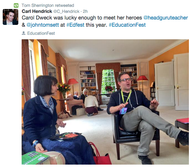 I attended various panels and discussion sessions that had lots of very healthy overlap, reinforcing some key themes. These included inputs from a host of big-hitters: Prof Rob Coe, Daisy Christodoulou, Tom Bennett (twice), David Weston, Philippa Cordingley, David Didau, Dylan Wiliam. And of course the mighty Carol Dweck. ‘The themes that emerge for me are: