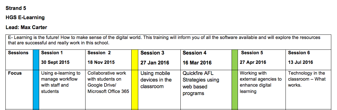 This looks great. I really like the idea of it being a two-hour block that is carved out of the school day. I think this shows a real commitment and recognition of the importance of CPD. I am particularly interested in the E-Learning and Research Based Learning Strands. Having worked as a study-skills workshop designer and presenter, I was shocked to discover that when I did my PGCE, there was barely any mention at all about how and why the brain learns (or not) or the psychology of learning. I hope that these CPD strands can be used to start to address this.