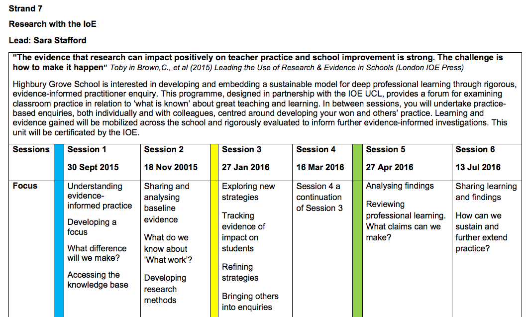 Strand 7 is delivered in partnership with the IoE giving participants the opportunity to undertake action research projects within the school.