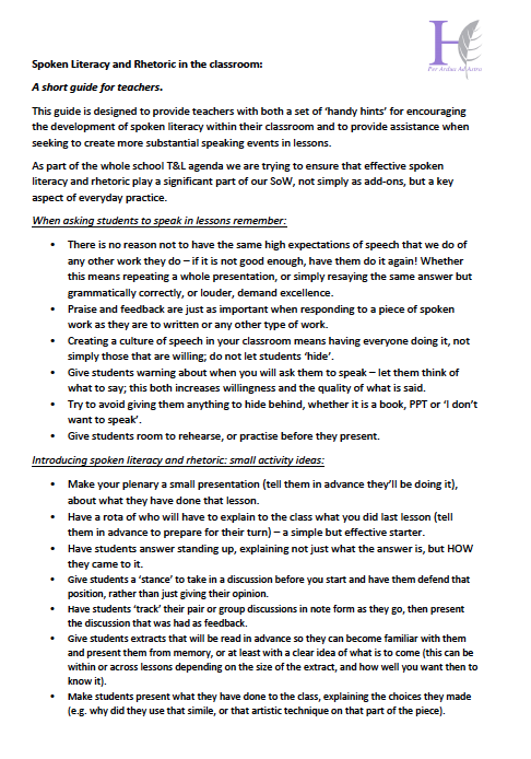 Rhetoric, as part of the Trivium, is central to our Framework for Teaching and Learning. We’re now starting to put the ideas into practice.  This week, our newly appointed Director of Spoken Literacy, Andrew Fitch, gave out this excellent guide to putting rhetoric into action in everyday lessons. It’s great. Shared here with Andrew’s permission.