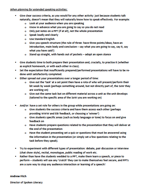 2. […] It is well worth re-reading Andrew’s guidance (Andrew Fitch is our Director of Spoken Literacy).  We need to discuss oracy as pedagogy (a phrase borrowed from Peter Hyman). Rhetoric is not an add-on; it is not something that gets in the way of content. It is a means of teaching the content as well as being a learning experience in itself.   http://headguruteacher.com/2015/09/09/making-speech-count-rhetoric-in-practice/ […]