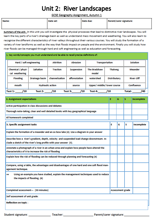 I explained the concept behind assignments in a previous post. We have now developed them in all subjects for all years 7-13. They are being rolled out this term. Here are some examples from History, Geography and Maths. Each one sets out the knowledge required, the tasks to be completed and the key assessments within a unit. These are stuck in students’ books, annotated by students and teachers as the units progress.