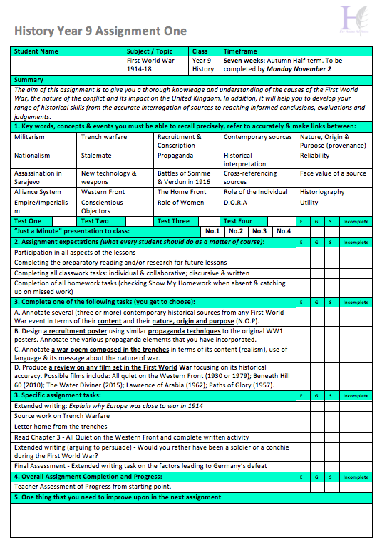 Similary, the marking criteria for the final extended writing task are not included here. The aim of the assignment sheet is to inform students and parents of the key elements that inform the teacher’s judgement of their progress and attainment and their status in relation to work completion at the expected rate.