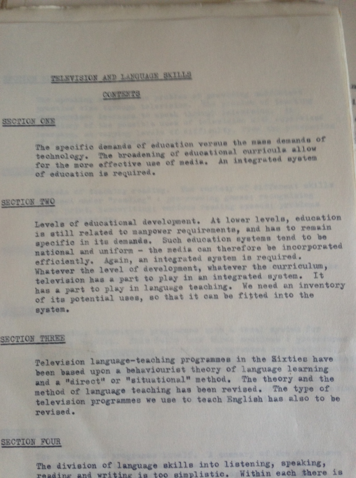 One of my most treasured possessions is the original manuscript for Dad’s book on the subject of teaching languages through the medium of television. Hearing him bashing away on his type-writer was a feature of my childhood – the tapping sounds from The Study, meaning he was busy. I’ve just been re-reading bits from the book and it’s fascinating to see how television in the early 70s was viewed very much as we now view the latest possibilities with iPads and various other elements of the new EdTech ‘revolution’. Many of the debates in the book echo the debates we are having now – it’s just that the tech in question is different.