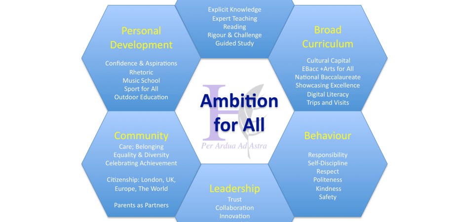 The concept is that there is one core purpose: Ambition for All.   This is our attempt to capture everything Highbury Grove is about in one phrase.  It echoes our motto but has a different emphasis:  Ambition for All applies to all students and to all six areas – the hexagons. The focus on ALL is the key; we’re an inclusive comprehensive school that has to deliver for everyone; no exceptions.  If could have been ‘Excellence’ instead of ‘Ambition’ – but that didn’t feel like our phrase; it felt borrowed and possibly over-used.  Ambition does a better job of suggesting that sense of being on a journey from where we are to where we want to be; ambition has no limits.