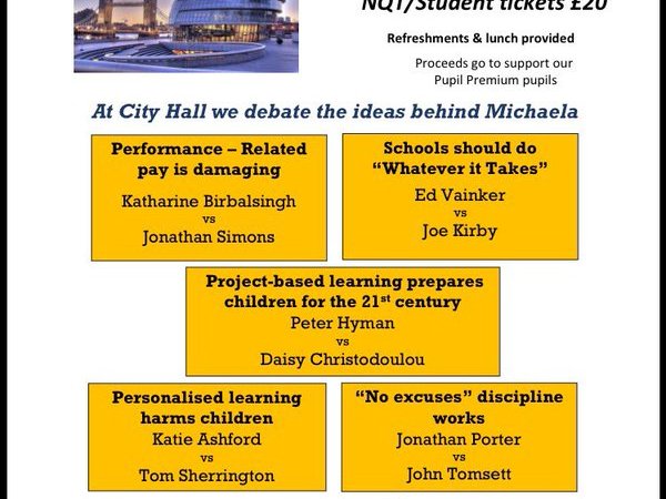 Although I had to leave by this time, (disappointed that this wasn’t up first because I wanted to cheer Katharine on), evidently it was a slam-dunk one-sided debate where even the opposer capitulated.  PRP is a terrible idea – as I’ve said before.  I’m glad that Michaela bucks the trend that tends to lump all of these ideas together.  Even if you run a Gove-lovin’ Free School with a knowledge-led, no-excuses, traditional curriculum and philosophy – PRP is still a terrible idea.  End of.