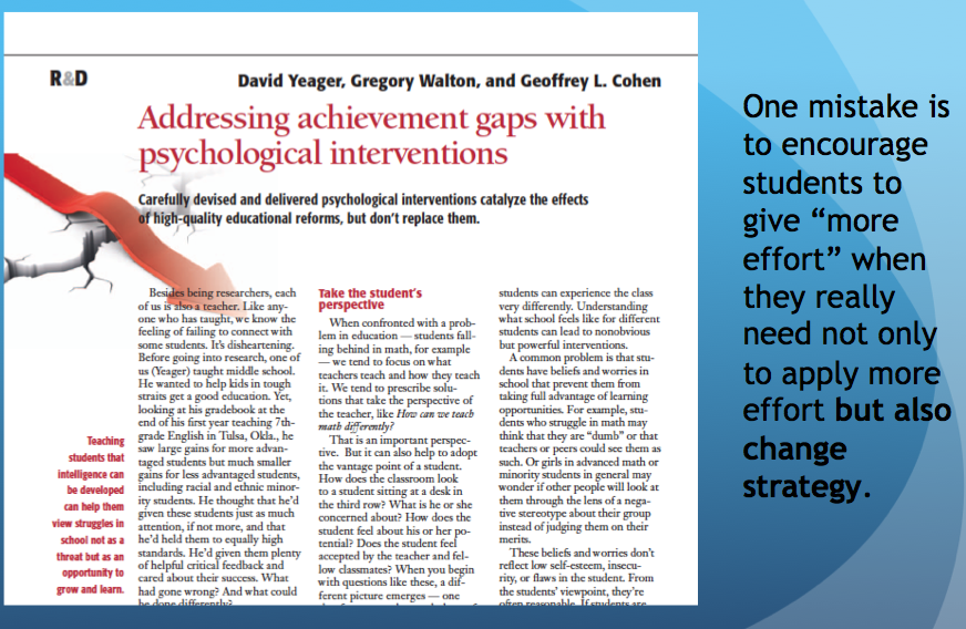 Our overall conclusion, supported by recommendations from other schools, has been that we should not do a big ‘We’re a Growth Mindset School’ launch. This is because it risks setting up a false picture about how far the actual practice has changed in this direction; a stealth approach is better.  We’ve also found this article very useful:
