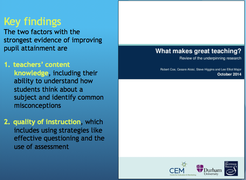 The goal is partly to ensure that our best teaching is superb – but mainly it is to ensure that our default mode teaching is secure.   Importantly, I do always stress that the basic skills of maintaining good behaviour and asking questions effectively probably override many other aspects of pedagogical know-how.  We do need to keep that in perspective.