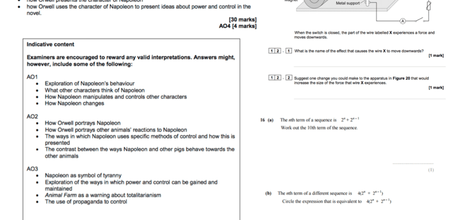 Students have to answer a 30 mark question related to the books or plays they’ve been staying. Here, there’s a choice of Animal Farm questions. I’ve illustrated it with the mark scheme.  Unlike Maths and Science, the range of possible answers is enormous so indicative content is given.  A recent ad hoc twitter survey has shown that many teachers find it difficult or impossible to distinguish consistently between a critical, exploratory, conceptualised response and a thoughtful, developed response – as suggested in the mark scheme.  It’s only possible to understand and teach this via reference to examples.  In this first year of the exam, there aren’t nearly enough around so people find it hard. Pity the poor examiners who have to do this for real; at least teachers only have to use it as a guide.