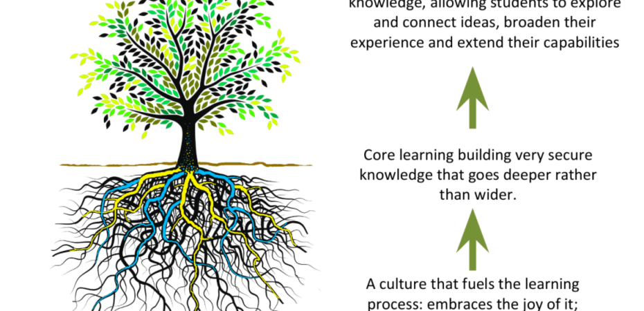 However – crucially – you can’t grow tall by missing out the structural element of the process. We can’t go from the roots to the canopy without a strong structural system to hang everything on. Everything I’ve read about learning confirms this sense that knowledge accumulates, building on prior learning with retrieval improving with practice; with higher level skills building on a secure knowledge base within specific domains; with creativity in various domains being informed by a rich knowledge base. There are no short-cuts. Of course, some knowledge can be gained experientially or informally – such as with jamming on a guitar instead of having lessons (my knowledge of guitar chords is all about shapes and sounds; I don’t know much about notes and keys; I’ve never had a lesson – but I can play and compose.) But this kind of physical learning doesn’t apply to a lot of important concept-based curriculum areas. The knowledge has to be taught – especially if you want children to be able to stand on the shoulders of giants.