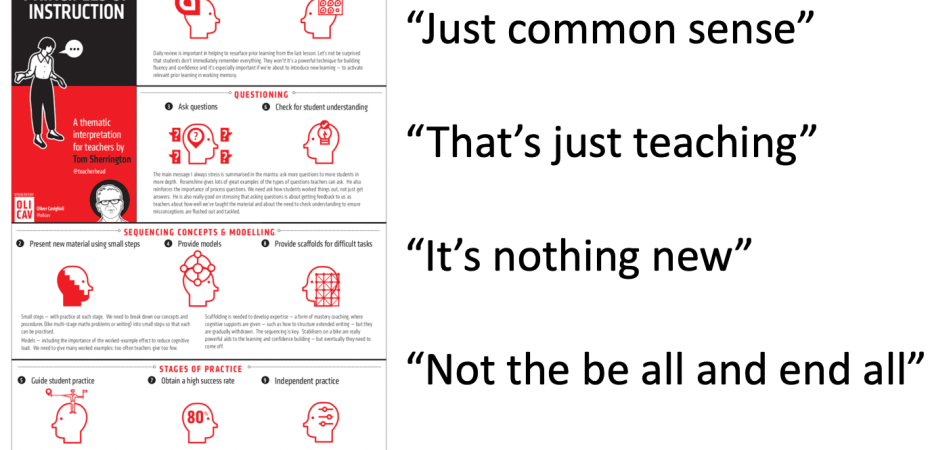 […] just common sense’. Sherrington has addressed this in an excellent post you can read here. In response to the argument that Rosenshine is nothing new Sherrington writes, “No, of […]