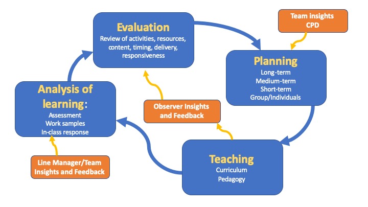 - Analysis of learning – identifying gaps in knowledge, performance, standards – is essential for informing the evaluation process. Whilst remaining teacher-driven this can be supported by someone who knows what the standards are and can offer insights. It’s important to reinforce the idea that we’re only looking to improve how lessons are run so that students’ learning needs are all addressed; it’s not about some kind of generalised song and dance.