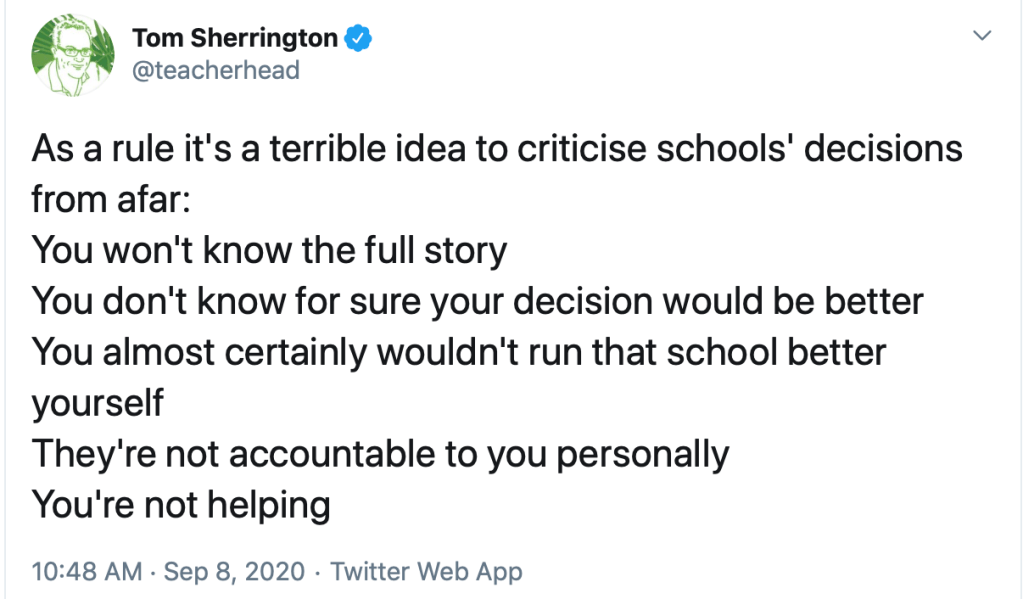 Why? Because, to repeat my tweet: You won’t know the full story. You don’t know for sure your decision would be better. You almost certainly couldn’t run the school better yourself. It’s ironic when some great teacher-champions (#trustteachers) are fine with questioning others’ decisions when they are nowhere near a position to know the details. Maybe, just maybe, in that community – with those parents, governors, teachers, students, their shared values and experience – the people who are there know what needs to be done? You’d think. And if they’re running a great school, really, who are you to criticise the details of how they achieved it?