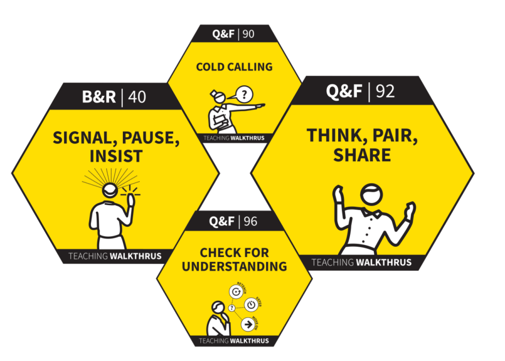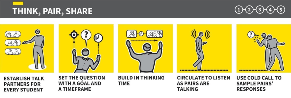 To use the language of the WalkThrus techniques, this means switching from everyone listening via Signal, Pause, Insist to everyone talking via Think Pair Share, in a context where Cold Calling and Check for Understanding are well-understood norms.