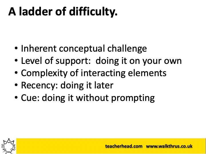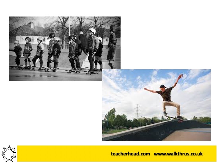 If students are going to emulate the idealised self-directed skateboarders, they need a sense of progression steps that constitute ever-increasing challenge. This can be tackling ‘harder questions’ but also can involve getting less help, mixing more concepts together, returning to material after time has passed since it was taught or removing ‘cue’ – those prompts the indicate which knowledge is required for any given task.