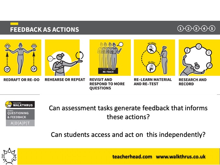 In line with the idea that teacher feedback should suggest actions students can take, if students are generating their own feedback based on assessment information, then the actions they need to take must still be part of the process. This isn’t always easy but can be built into routines. If you find out X about your work.. then do Y. Eg routines around practising, redrafting, re-reading, re-studying and re-testing – at the right point.