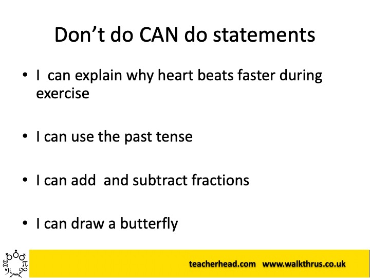 However it can be turned around. Instead of ticking off a list saying ‘I can explain ….’ – make it a prompt for a check: Explain why your heart beats faster during exercise. This invites a response of unspecified depth, each time it is encountered. It prompts students to explore and deepen their knowledge, not tick it off and move on. I think it is much more than a semantic change – it affects how students view themselves and their knowledge.