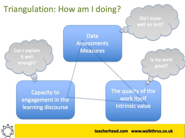 Students understand their sense of ‘how am I doing’ much the same way that teachers do: by triangulating various sets of information: Their sense of their understanding – eg how well they can explain things in discussions; the quality of the work they produce – against some sense of the range of relevant standards – and their performance in assessments, their scores and their sense of whether these are good scores.