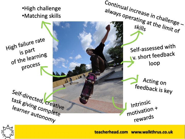 Skateboarding at the skate park offers an example and metaphor for self-direct learning where high challenge, high motivation and autonomy and linked to short self-generated feedback loops. Boarders know when they’ve done well; they know what standards mean; they’re motivated to improve continually. It’s intrinsically rewarding. Learning goals are constantly adjusted to provide incremental challenge.