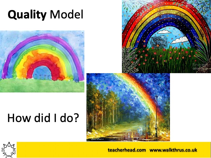 Very often standards are hard to define through language alone – eg with criteria statements. It’s often essential to show what standards mean by comparing examples. Students can develop an internal schema for standards by examining contrasting exemplars and lining their own work alongside them to determine the extent of their success. They can then self-regulate as they produce work, aiming for a standard derived from this process; they don’t just ‘hit and hope’.