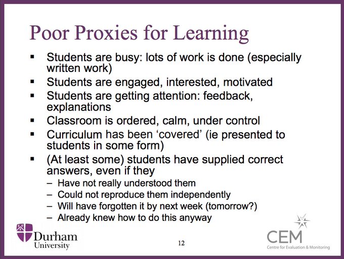 As I shared recently on twitter, one particular slide from the presentation encapsulates a lot of the key thinking and is one I have found myself returning to and referring to countless times. In terms of getting ideas across, the ‘poor proxies for learning’ concept was something of a game-changer: