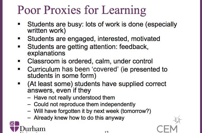 Poor Proxies is a powerful prompt to probe further to establish whether learning has happened rather than to assume. It’s a reminder of the danger of focusing too much on task completion, immediate performance and behavioural compliance when they may or may not in themselves foster the learning you’re seeking. It has major implications for the (dubious) validity of lesson observations as the presentation explores in some detail.