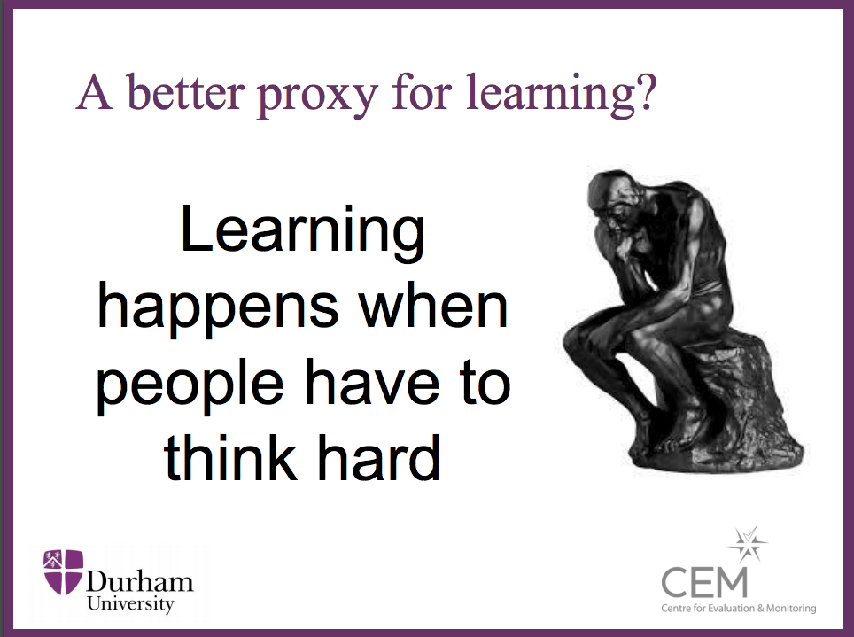 This all links to various other ideas in Prof Coe’s presentation and to ideas from Dan Willingham, Graham Nuthall, Dylan Wiliam and others – the need to think about thinking, ‘hidden lives’ and eliciting evidence of learning:
