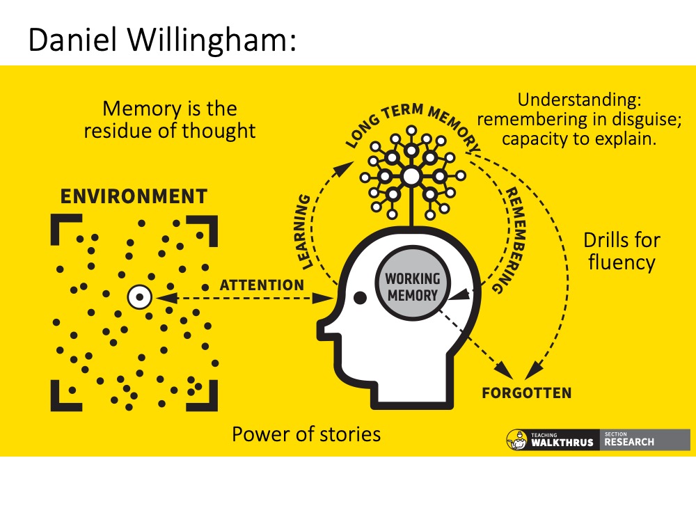 Each of these simple labels needs unpacking but the main barrier to understanding – as Nuthall reports in his work – is when new knowledge doesn’t have sufficient grounding in students’ existing knowledge. It’s a massive issue – the assumptions we make about students’ concrete/life experience, background knowledge, vocabulary, fluency of recall. That ‘building on sand’ issue is huge – as I explore here. The major challenge of teaching is to support a group of individual students to each construct secure schema for a curriculum area in parallel with each other – when we can’t readily see how well that’s going at any given point. And yet that is what we have to do: each student has to make sense of the ideas themselves – in their own heads. We can’t just zap them with knowledge; they can’t just down load it!