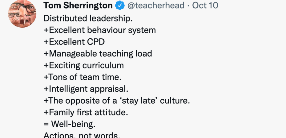 Distributed leadership. A lot of stresses and strains emerge from feeling powerless within a decision-making process that then has an impact on your life! Distributed leadership takes decision making to the point where it is closest to the action – rather than from on high. This links to the much-prized idea of teacher autonomy but avoids the problems of dumping people into situations where they flounder or feel overwhelmed. It means giving people the right degree of autonomy within a wider well-led organisation, not leaving people to sink or swim or to simply do what they’re told without having a say.