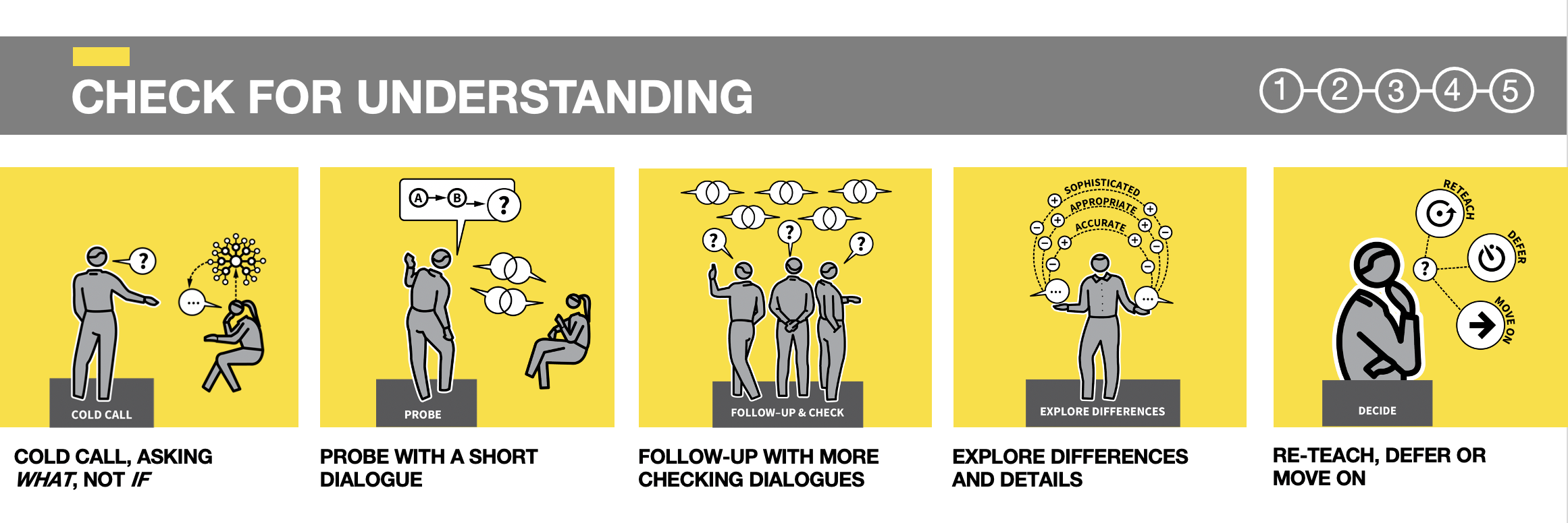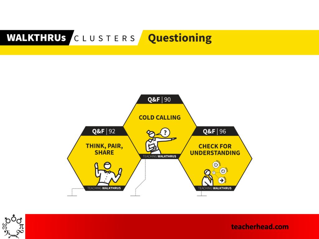 In the flow of instructional teaching, checking for understanding is supported by a range of questioning techniques, all underpinned by cold calling – so that every student engages in thinking and is ready to respond. It can be important to switch between cold calling, asking individuals – and pair-share, where everyone has a change to air their thoughts and rehearse their explanations. This gives the teacher a better sampling of the level of understanding across the class.