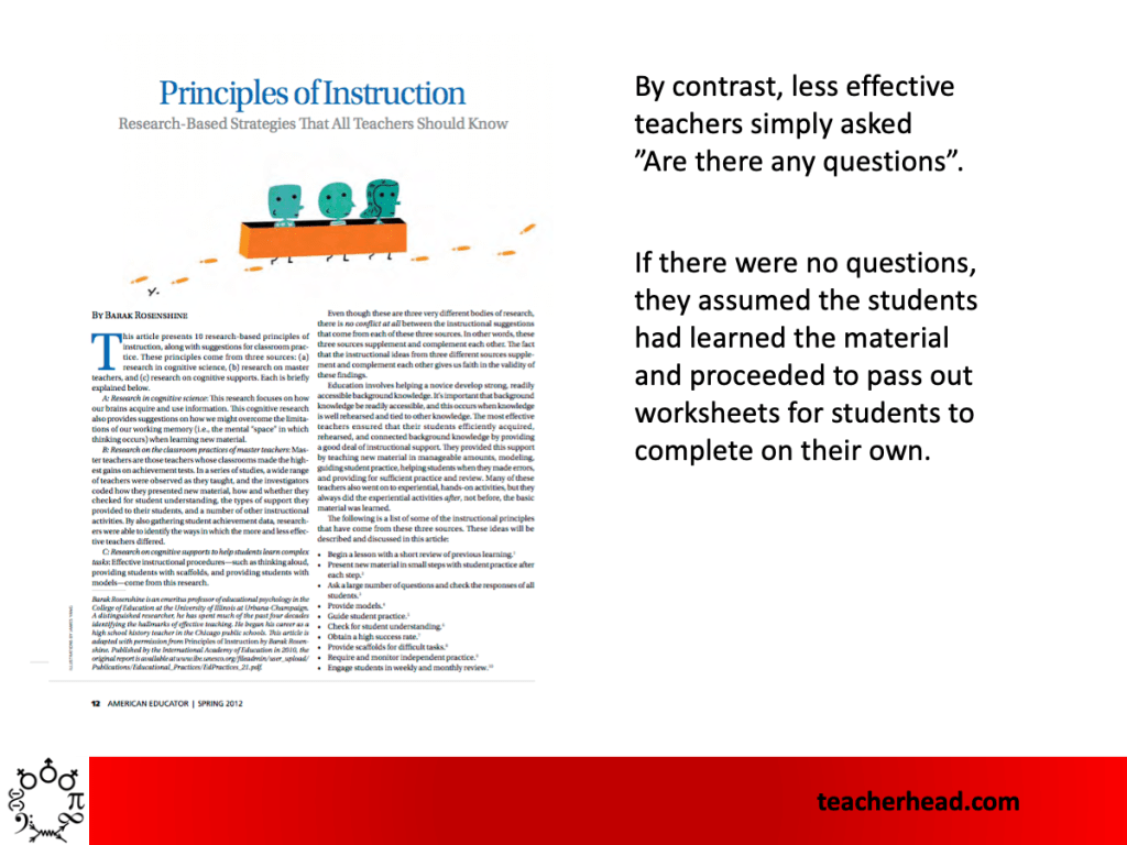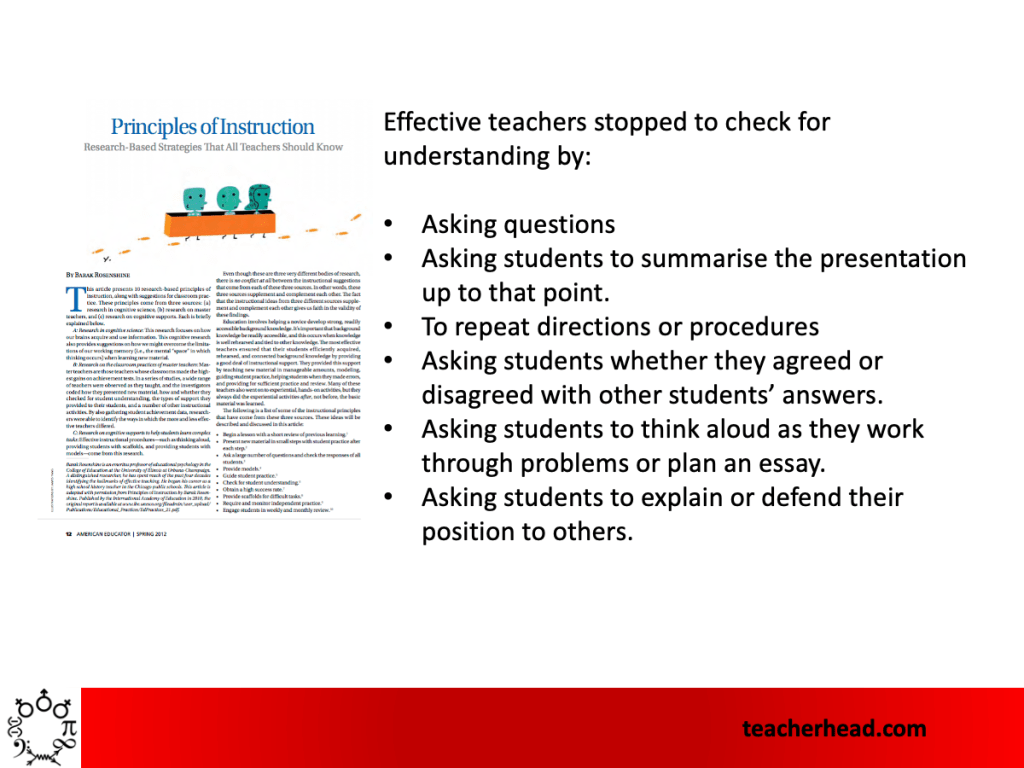 He tells us how not to check for understanding – ie by simply asking ‘have you understood?’ This tells us almost nothing – as students rarely so no or could be wrong in saying yes. But, most importantly, there are always degrees of understanding. Instead of asking if, we should ask what student have understood. Rosenshine gives us a nice list of ways teachers can check for understanding.: